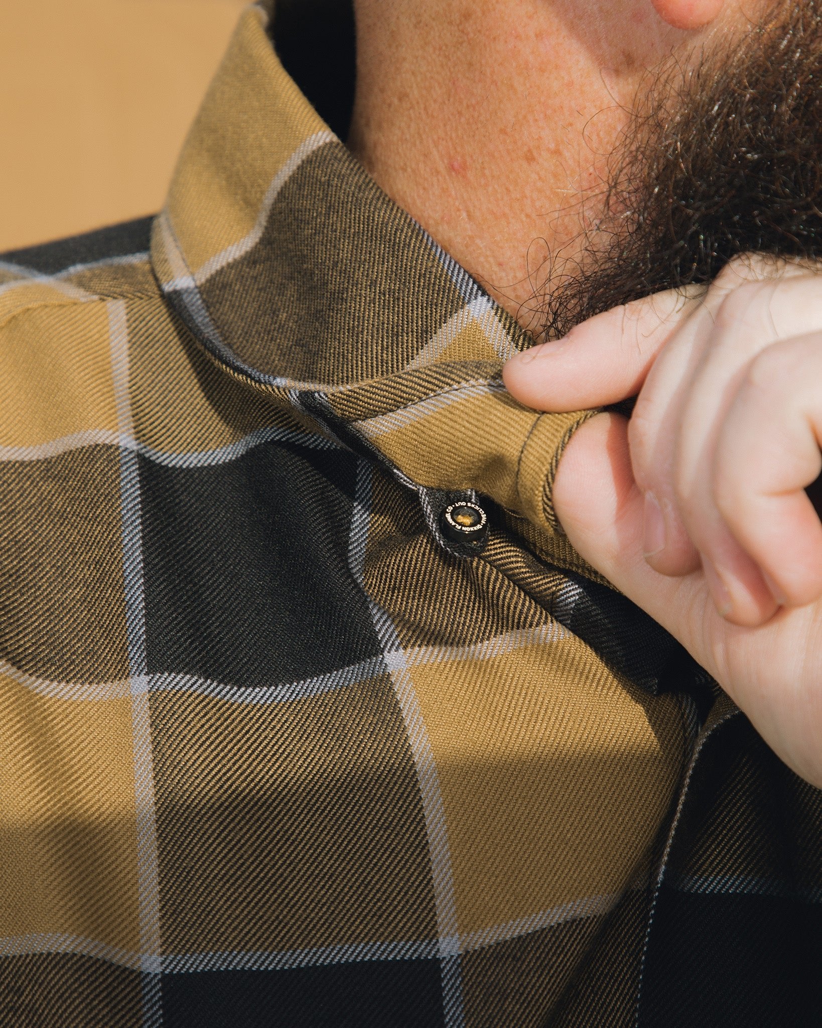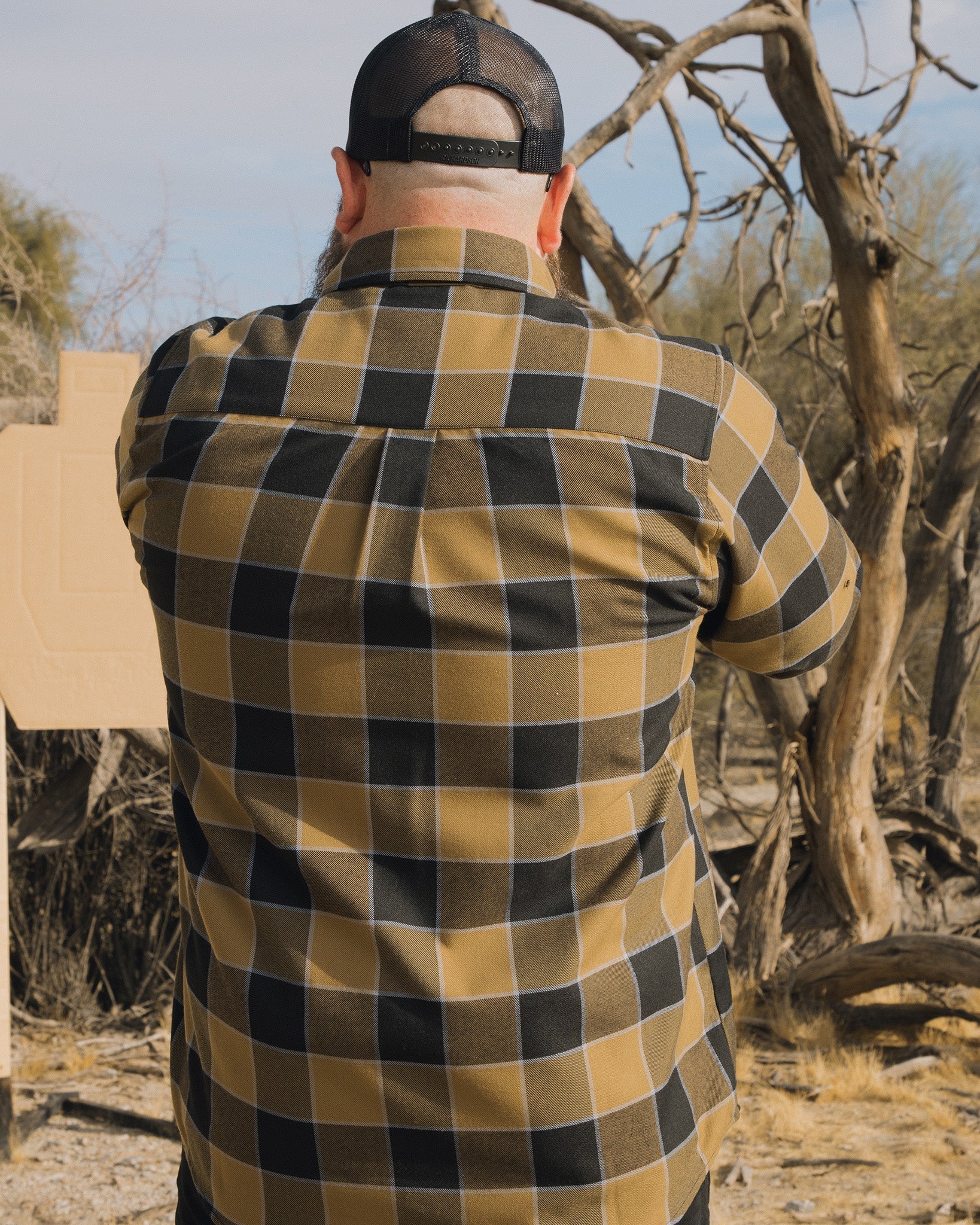Inspired by the grit and precision of military tactics, the 5 Clicks Out Flannel features an allover black, gold, and gray plaid pattern that offers a clean and classic design, while our signature D-Tech™ blend provides the comfort of soft to the touch flannel. Constructed to be breathable for the performance you demand, yet durable for the rugged lifestyle you live.