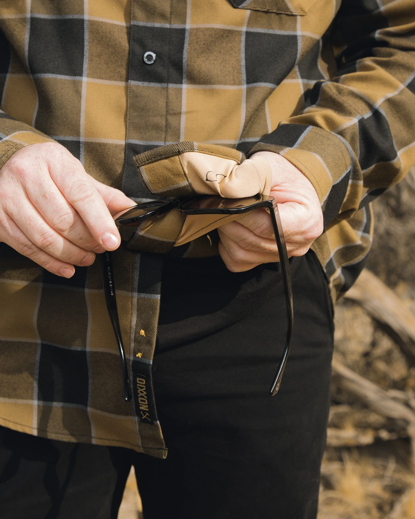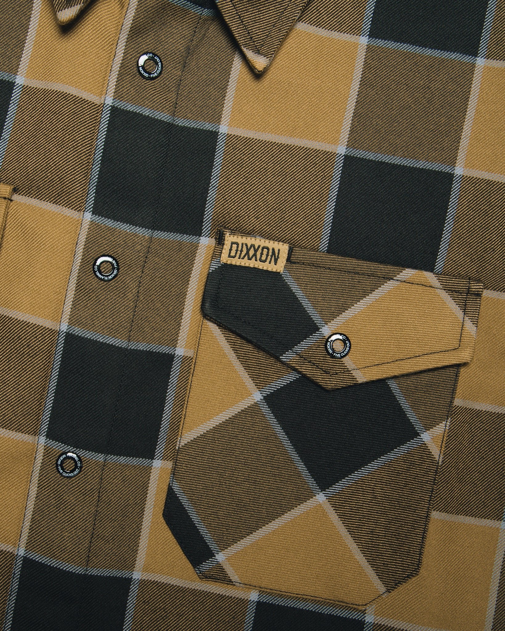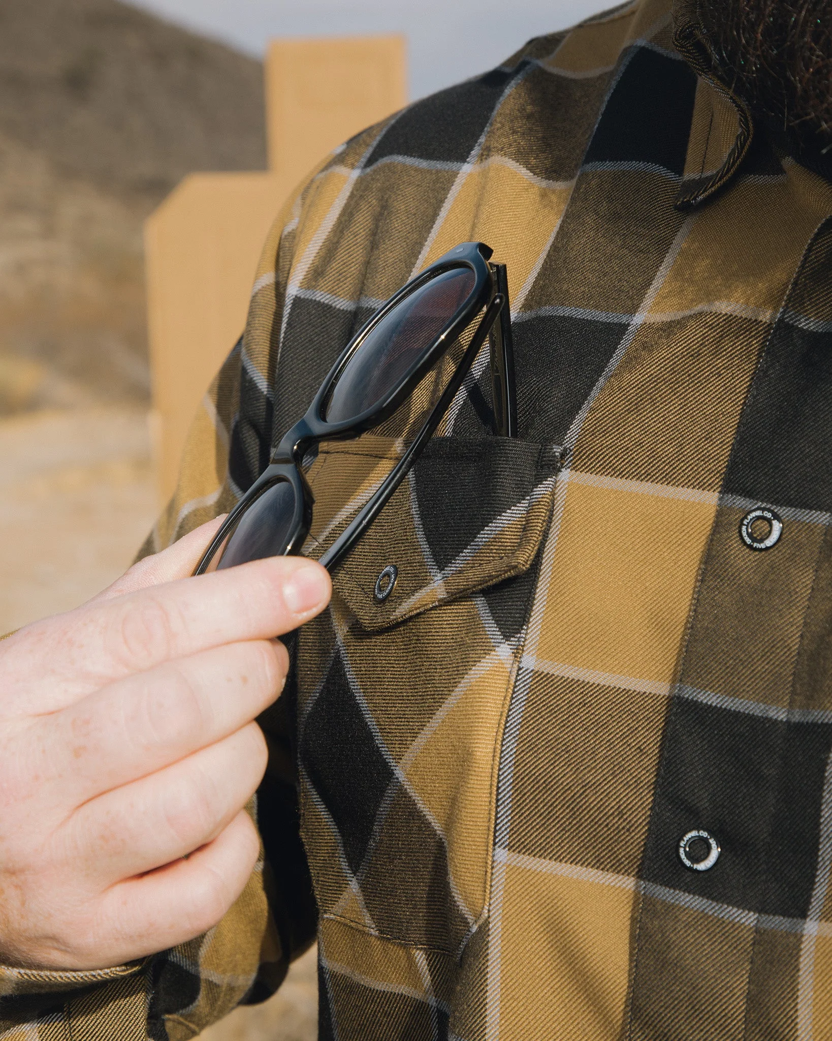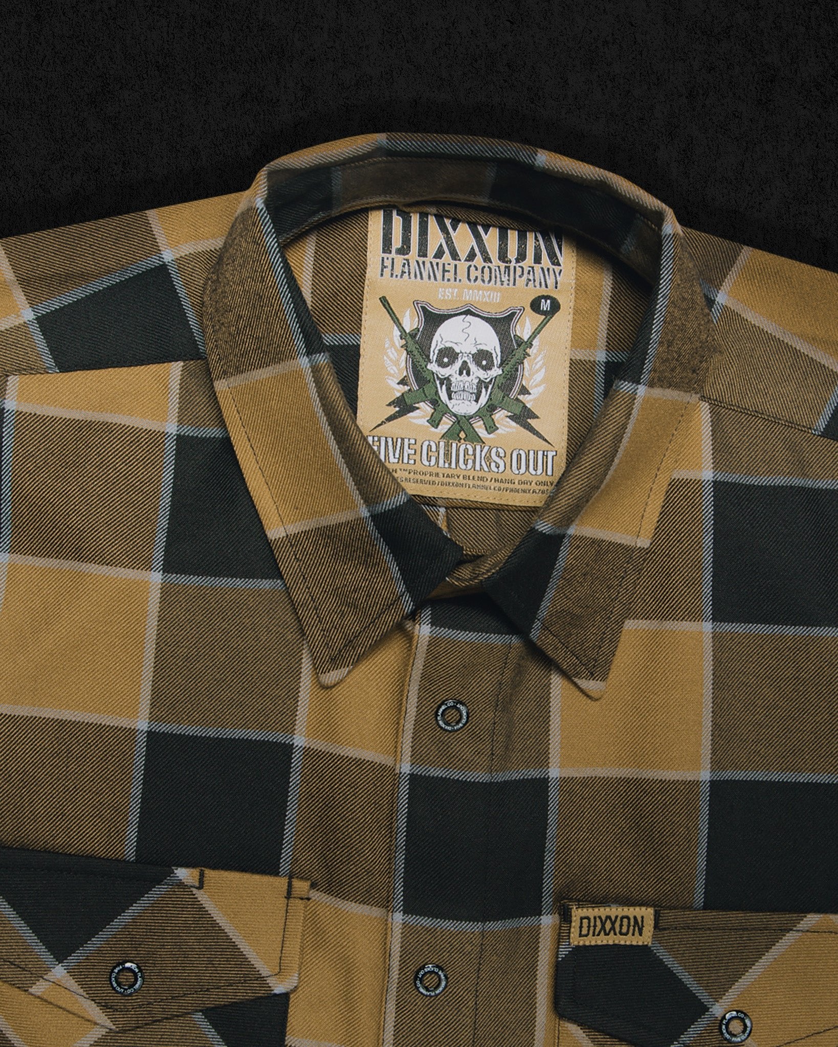 Inspired by the grit and precision of military tactics, the 5 Clicks Out Flannel features an allover black, gold, and gray plaid pattern that offers a clean and classic design, while our signature D-Tech™ blend provides the comfort of soft to the touch flannel. Constructed to be breathable for the performance you demand, yet durable for the rugged lifestyle you live.