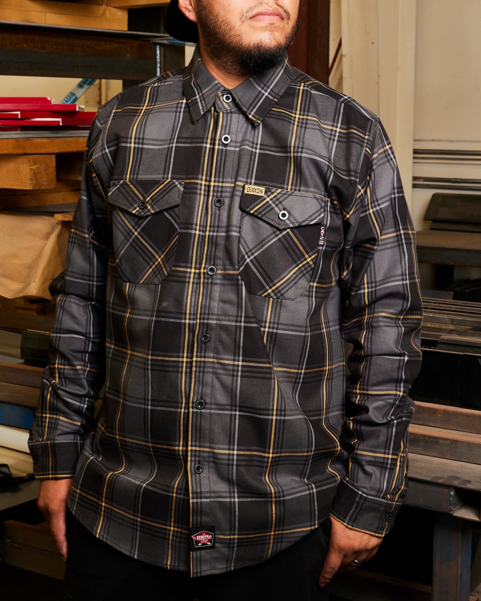• Men’s black, gold, and gray plaid patterned flame resistant flannel shirt