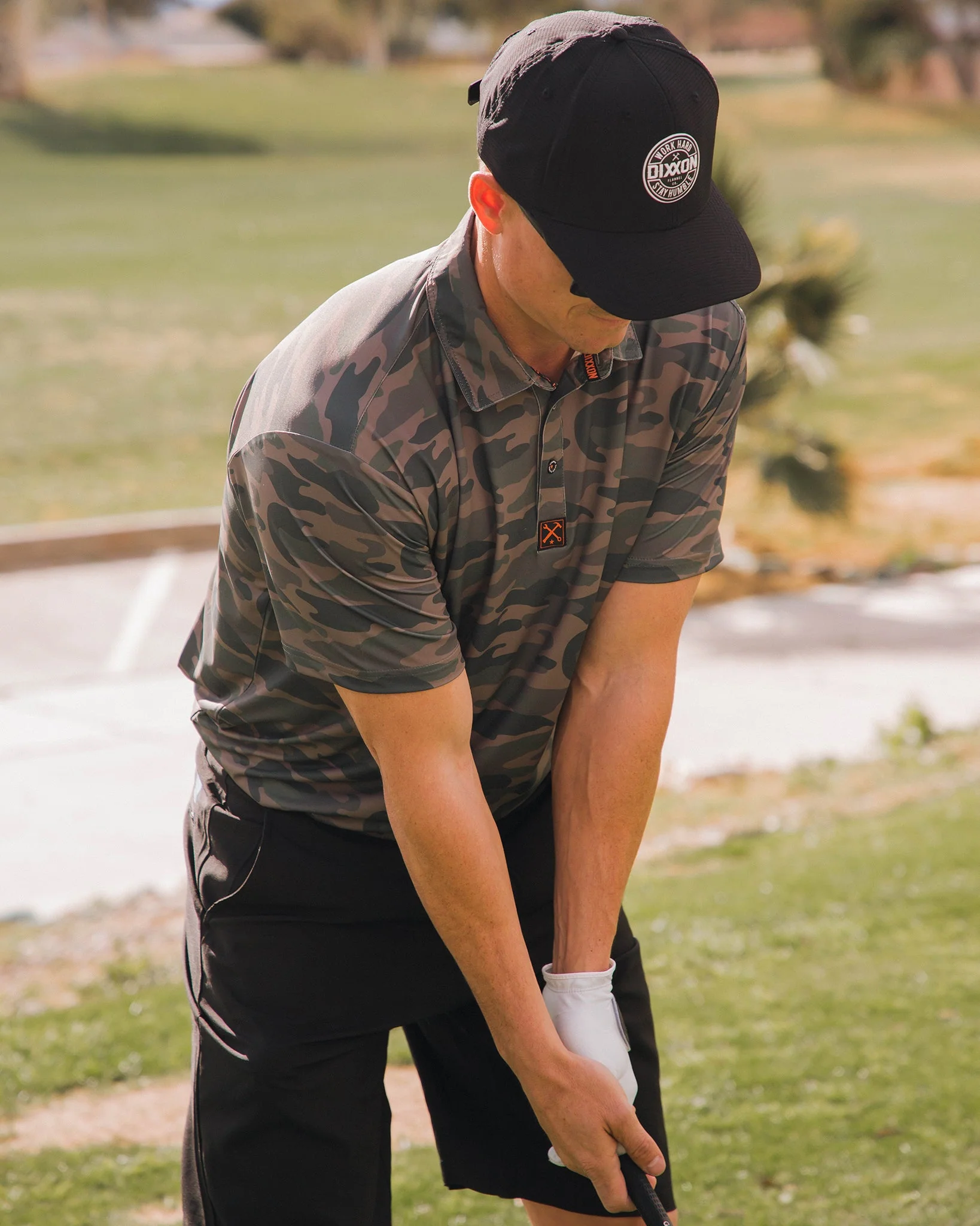 - Men's green camo performance party polo