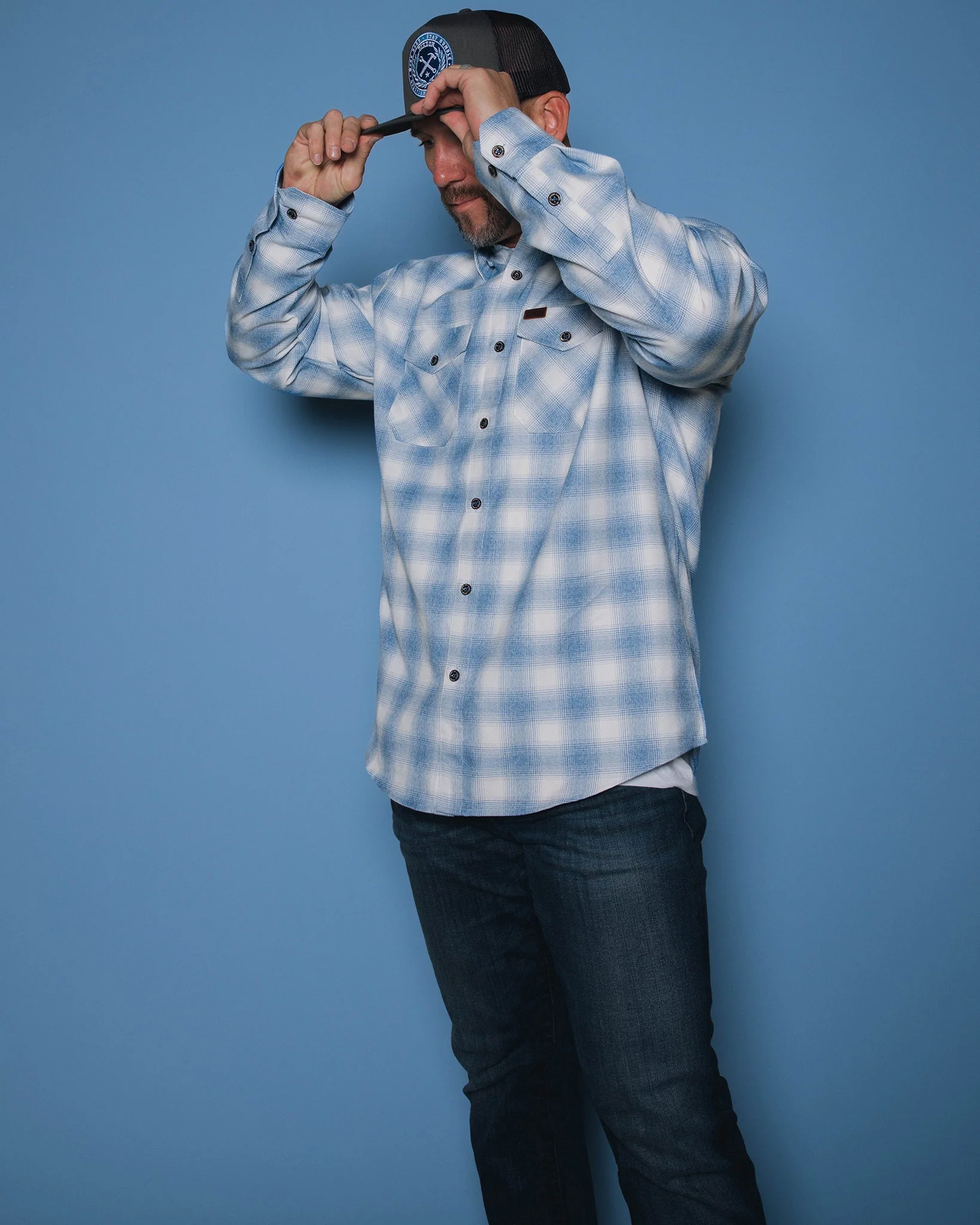 • Men’s blue and white plaid patterned flannel shirt