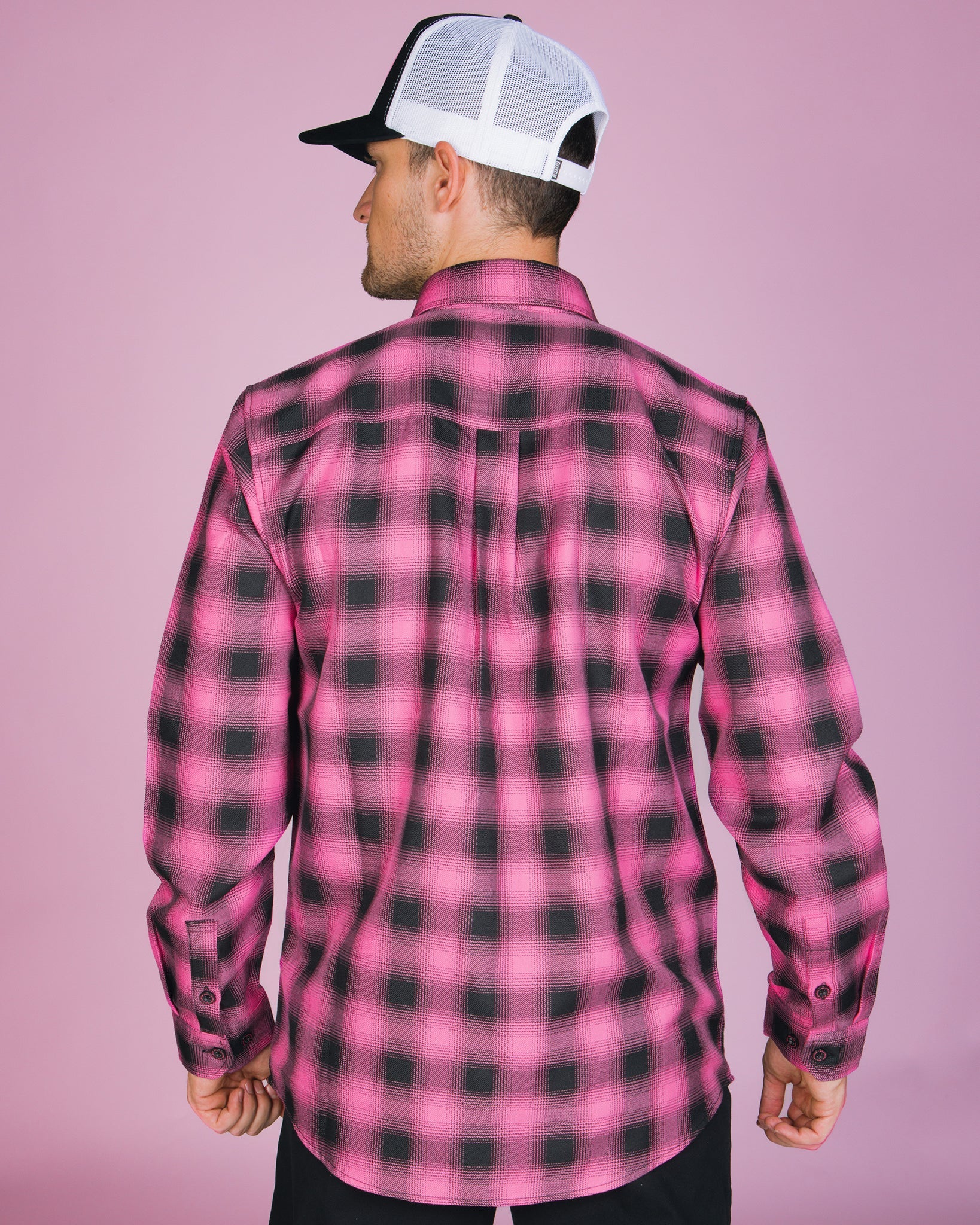 - Men’s pink and black plaid patterned flannel shirt