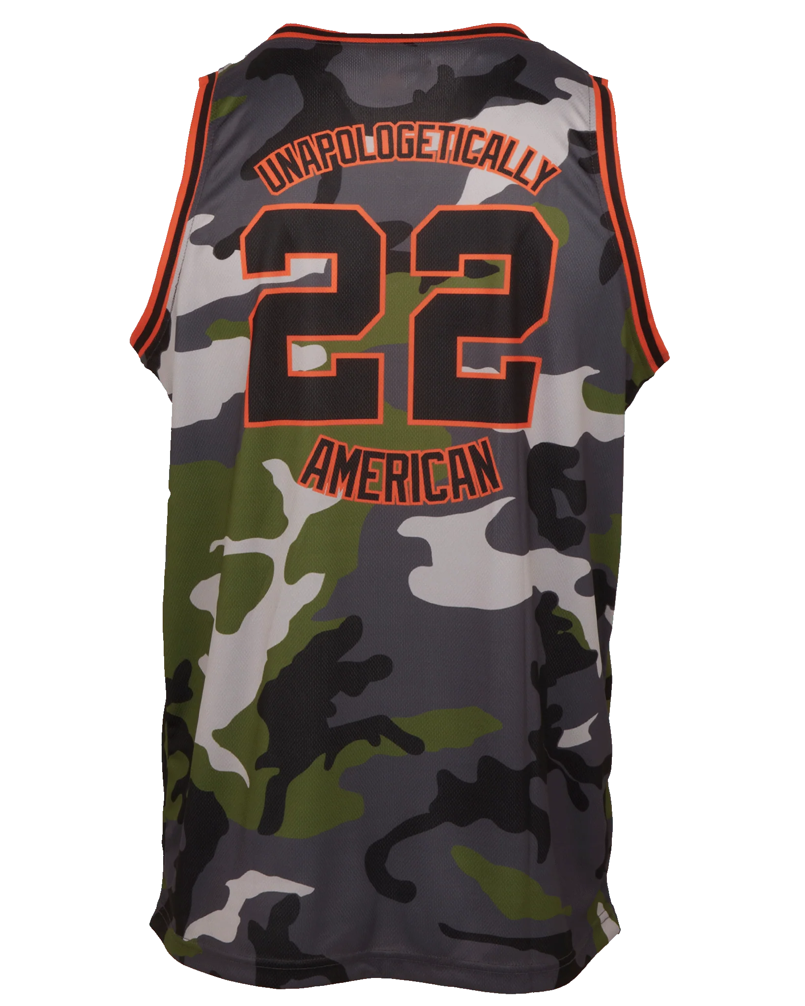 - Orange and black "Unapologetically American" 22 graphic screen-printed on the back