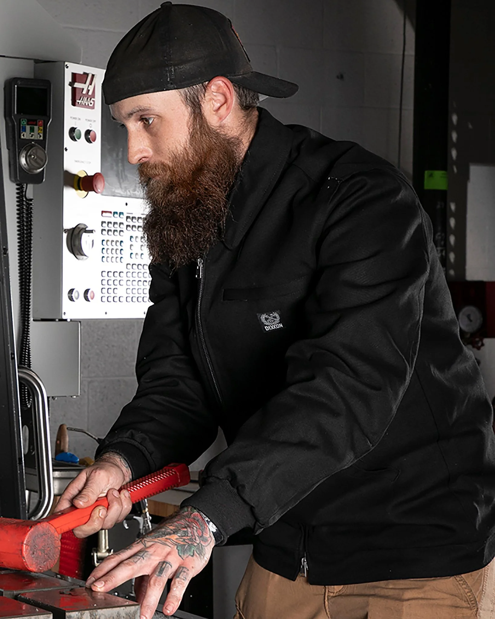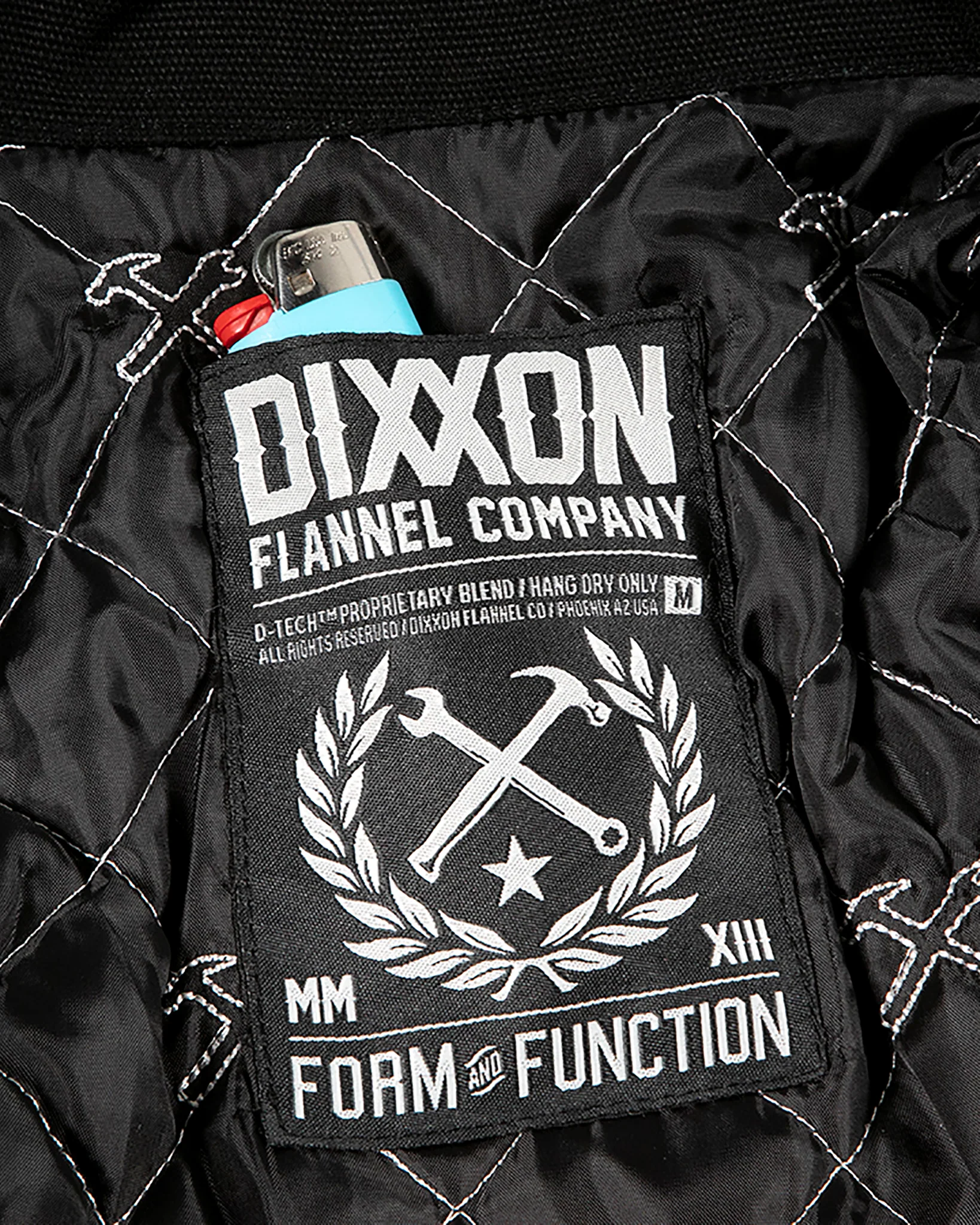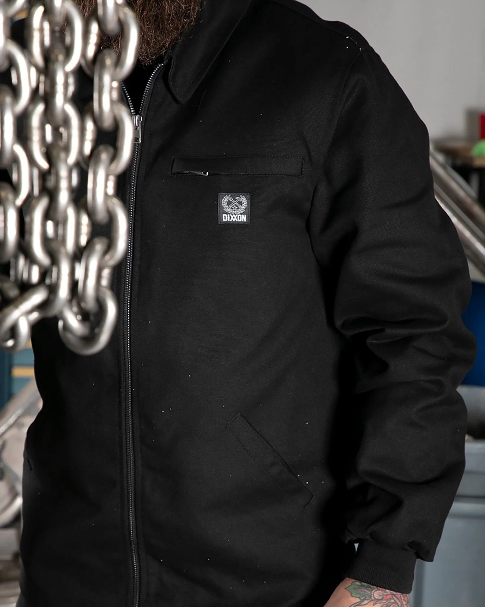 - Exterior left chest zip pocket with Dixxon brand tag
