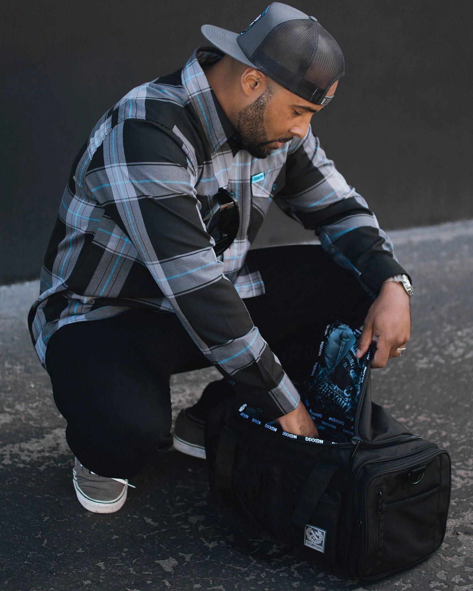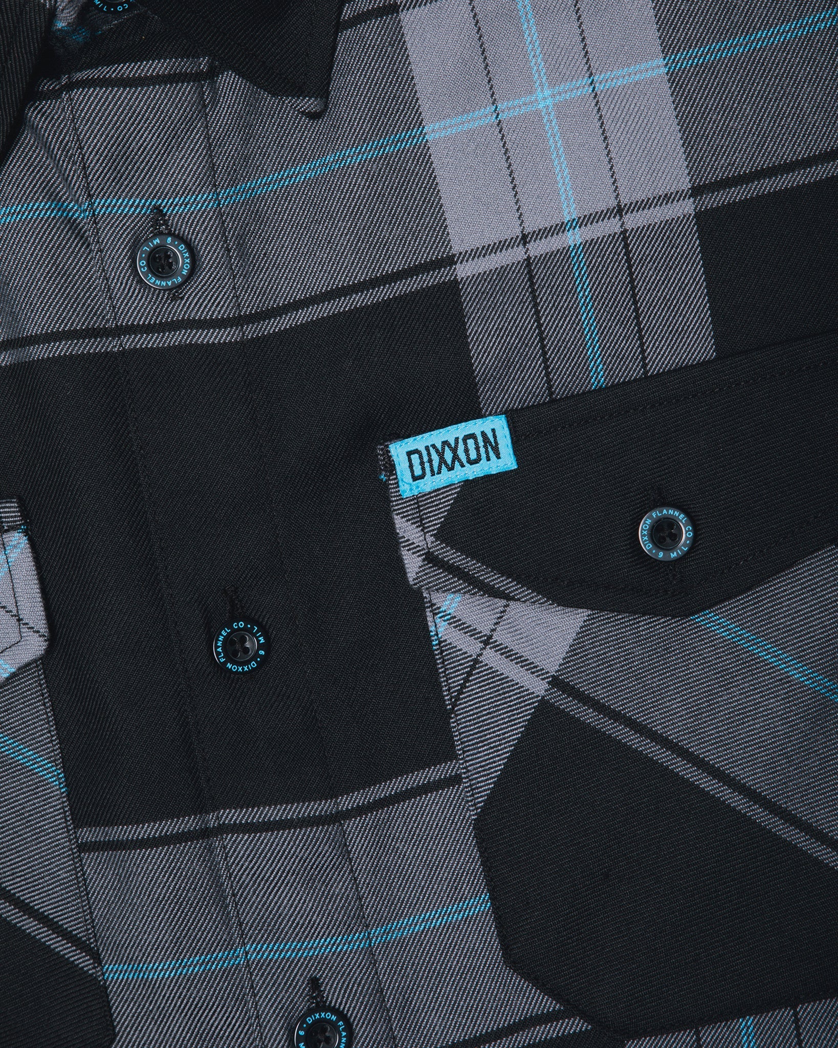 - Blue and black Dixxon brand tag on the left chest pocket