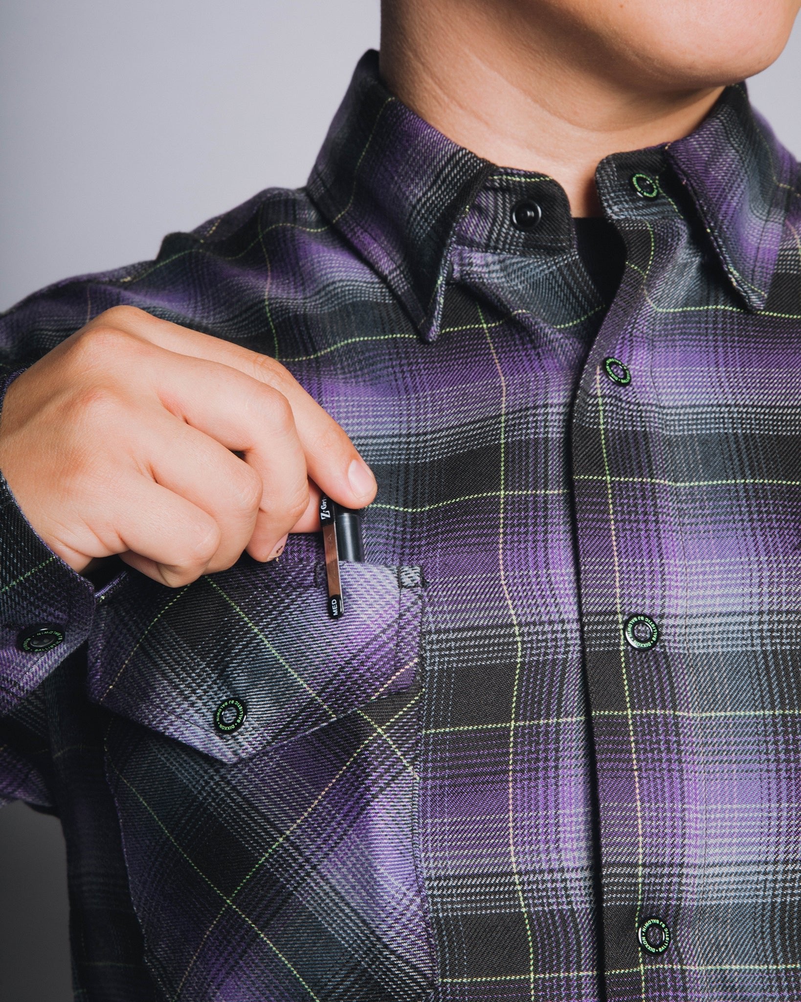- Men’s purple, black, gray, and green plaid patterned flannel shirt