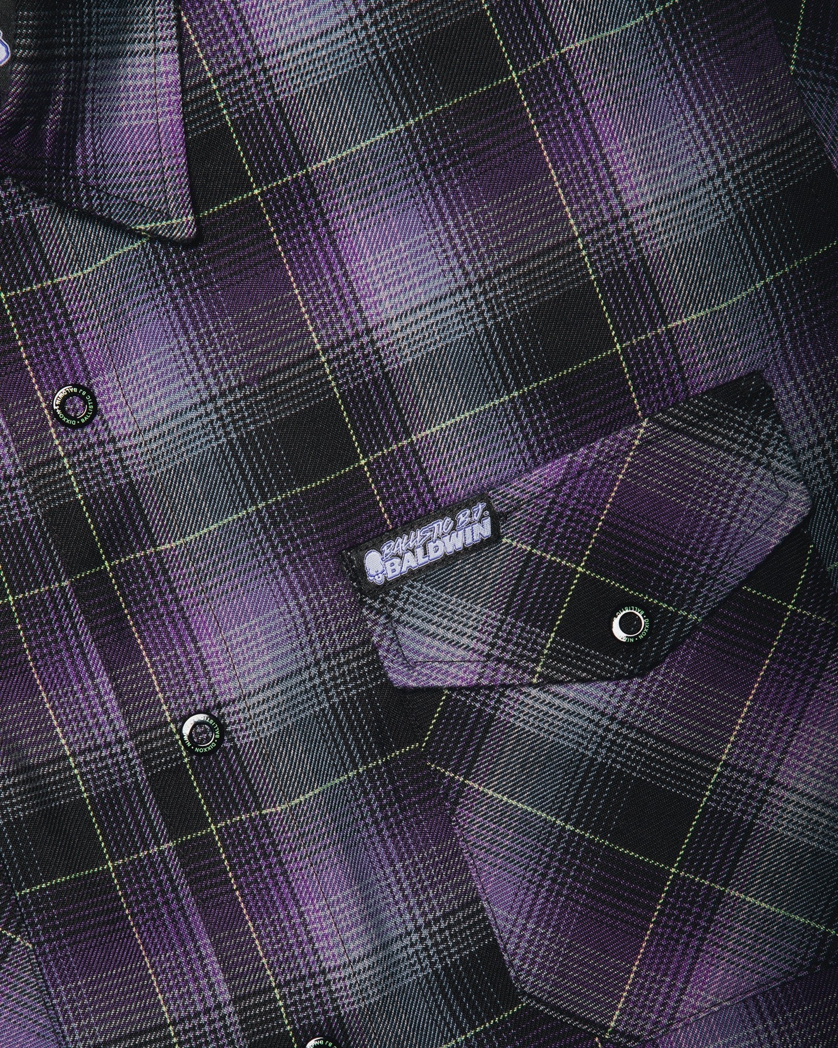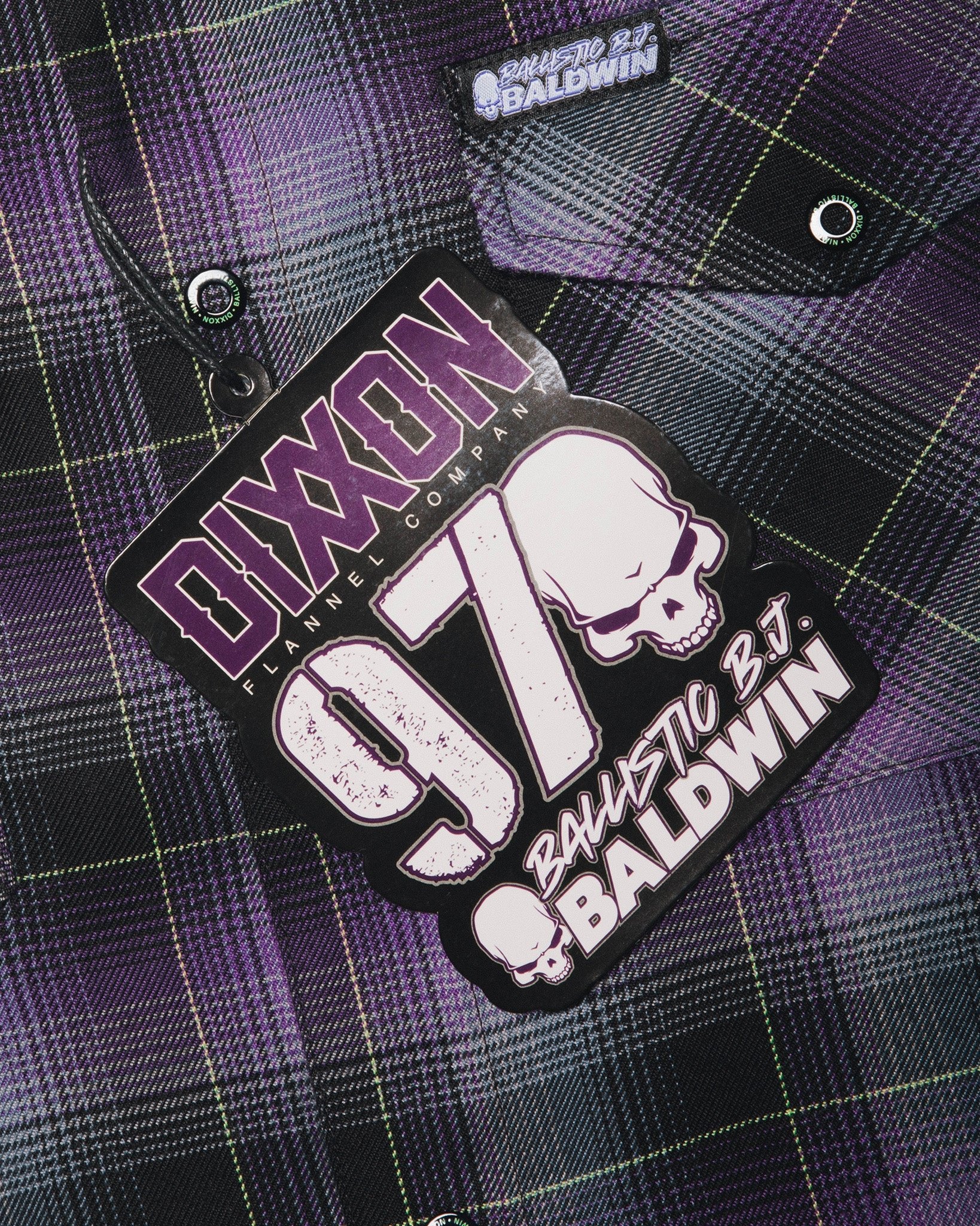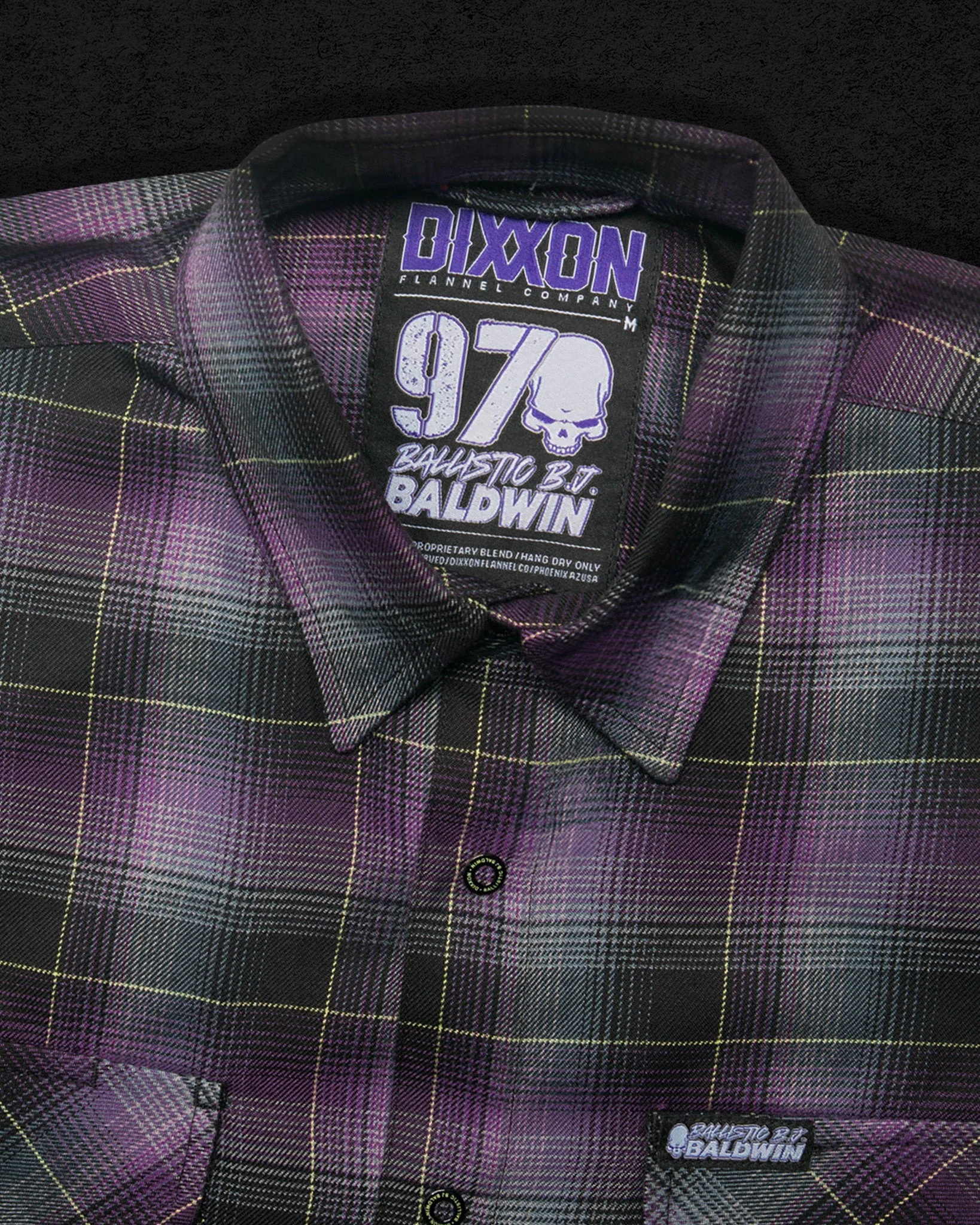 - Black, white, and purple Ballistic B.J. Baldwin brand tag on the left chest pocket