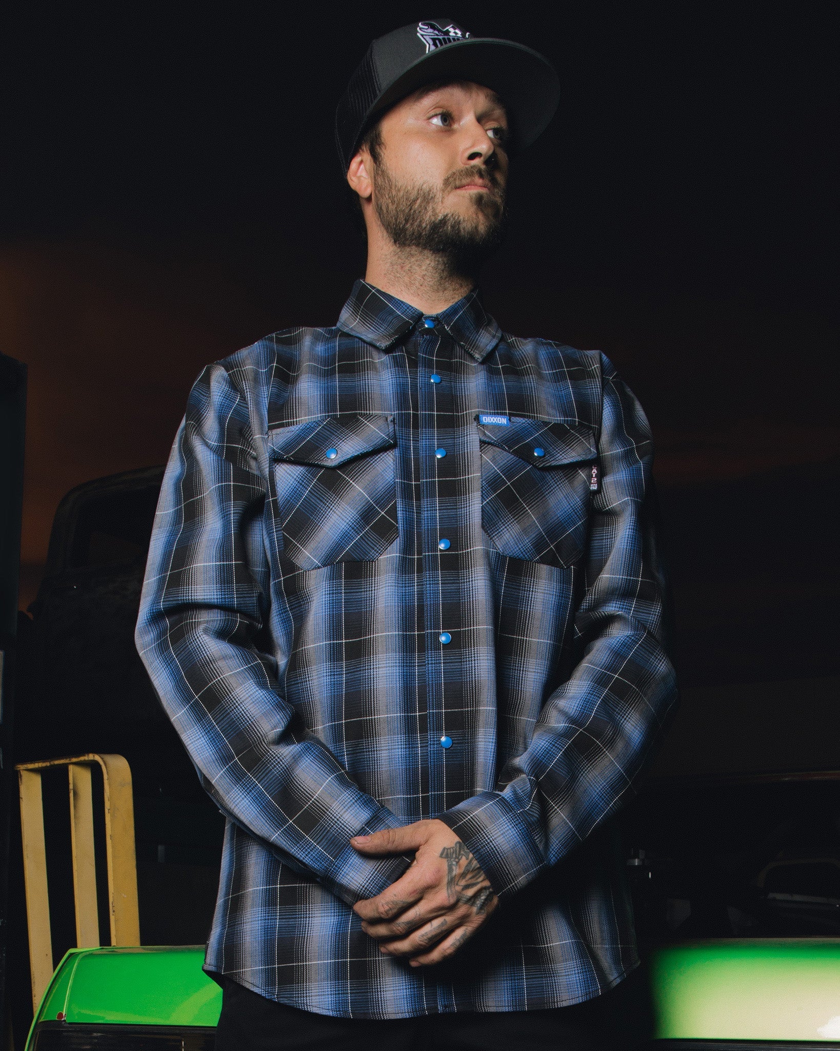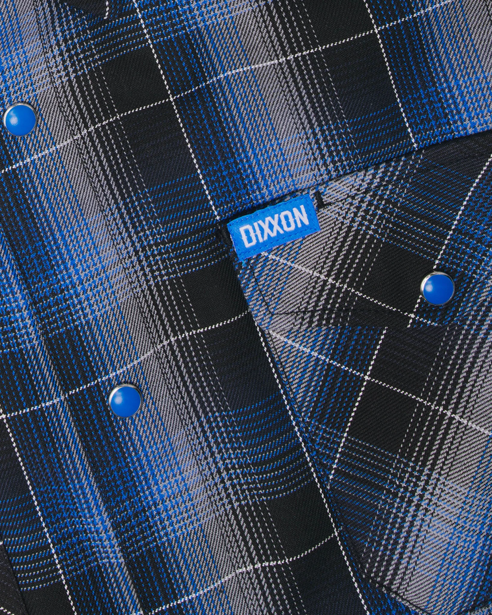 - Blue and white Dixxon brand tag on the left chest pocket with an NFPA 2112/CAT 2 label