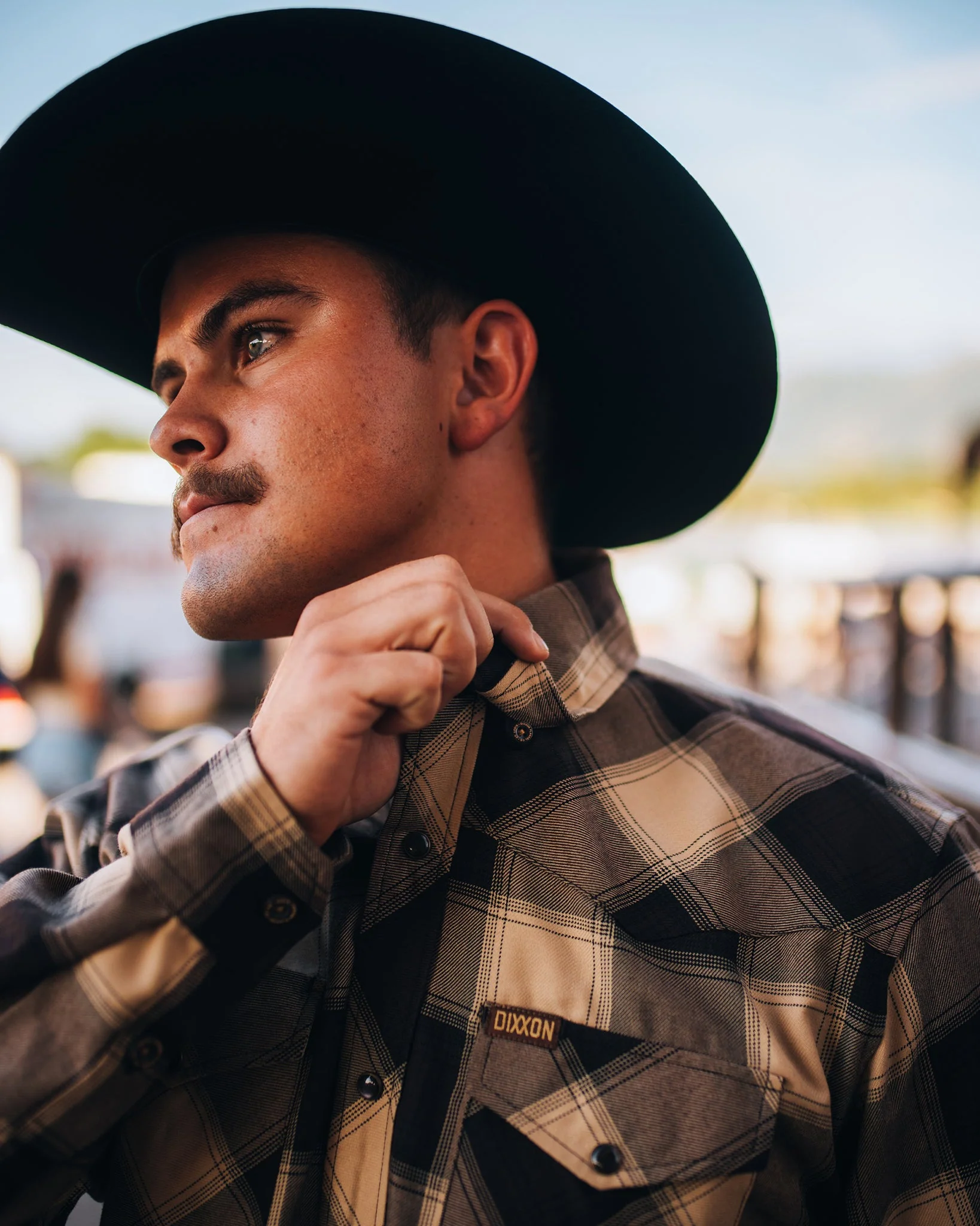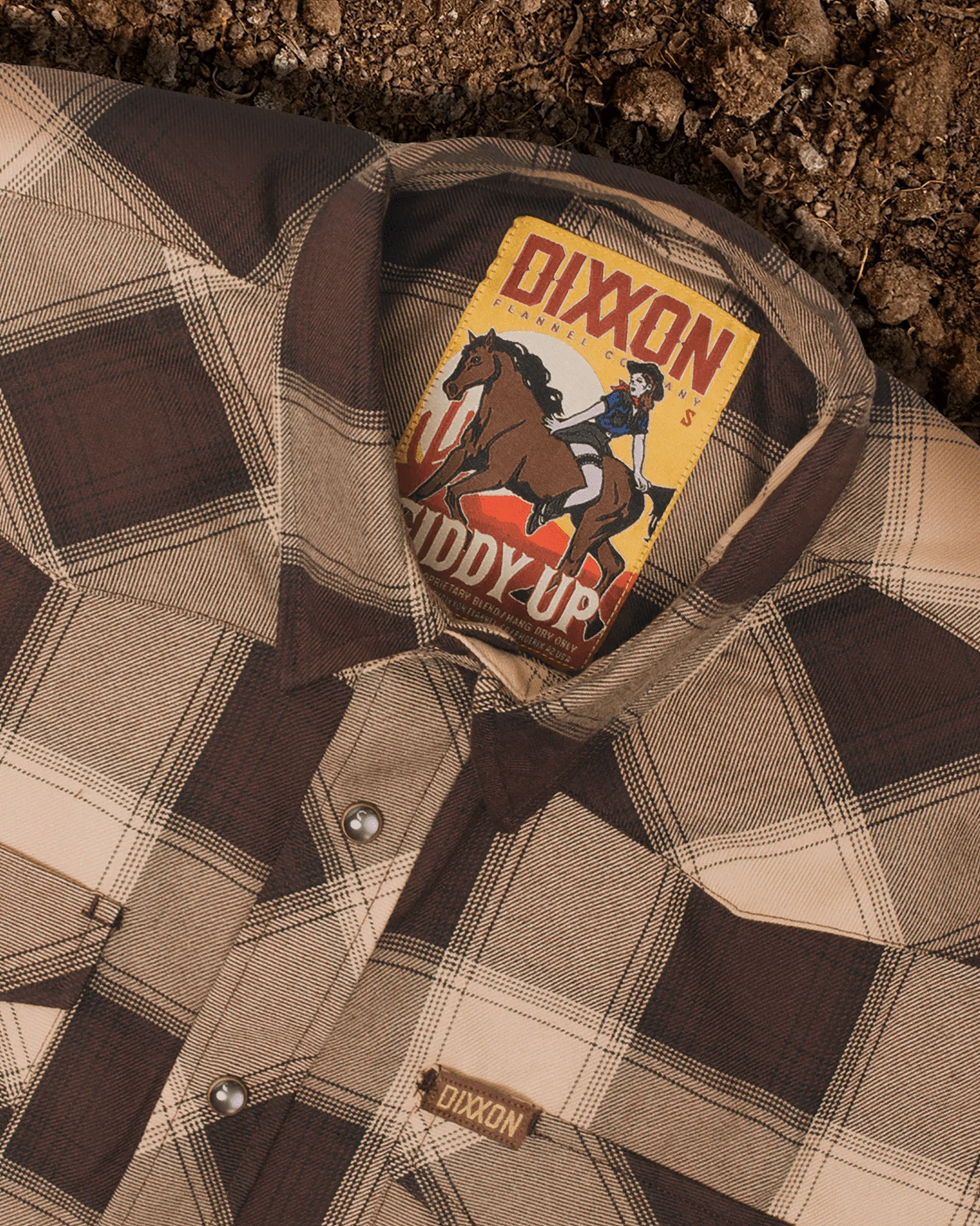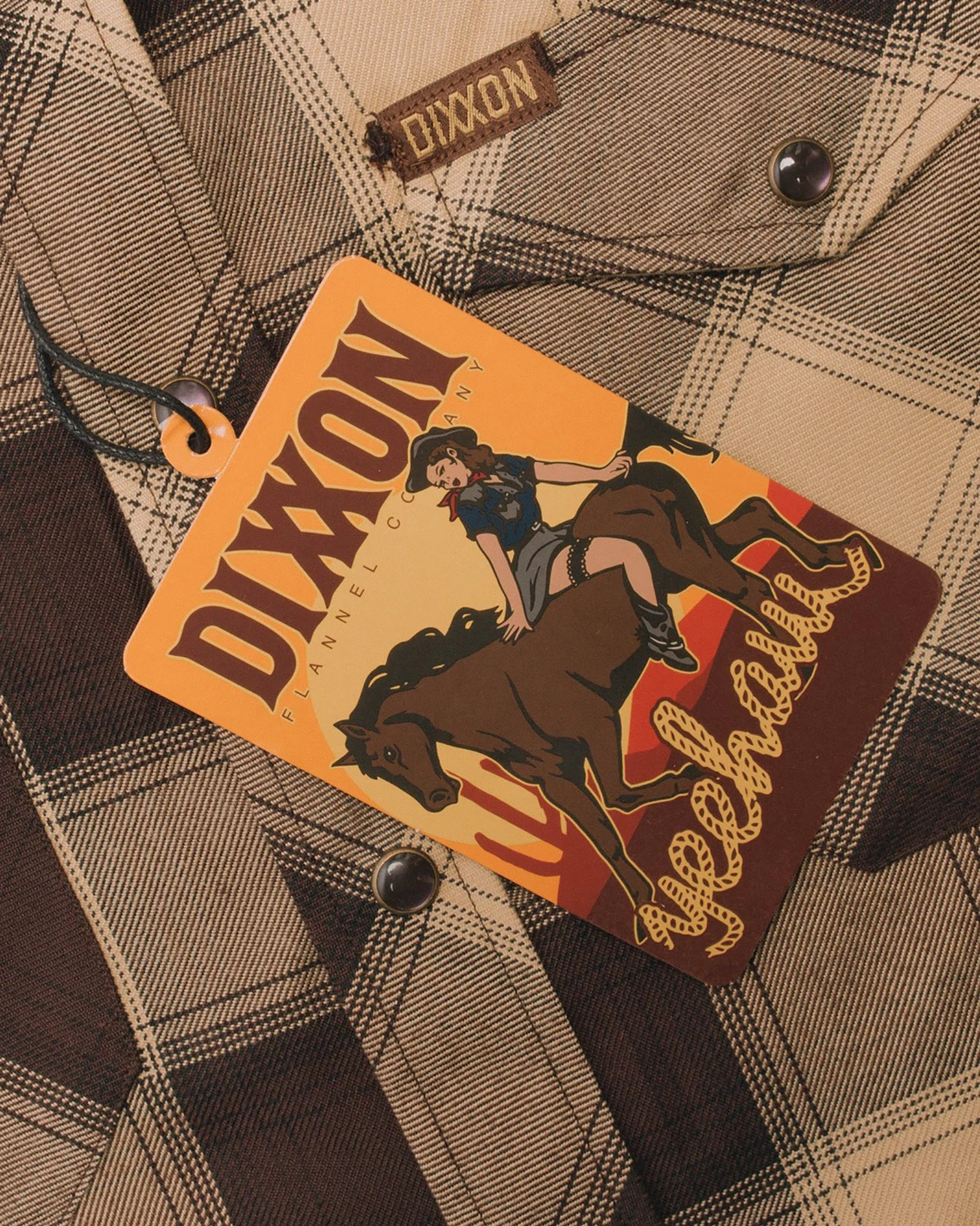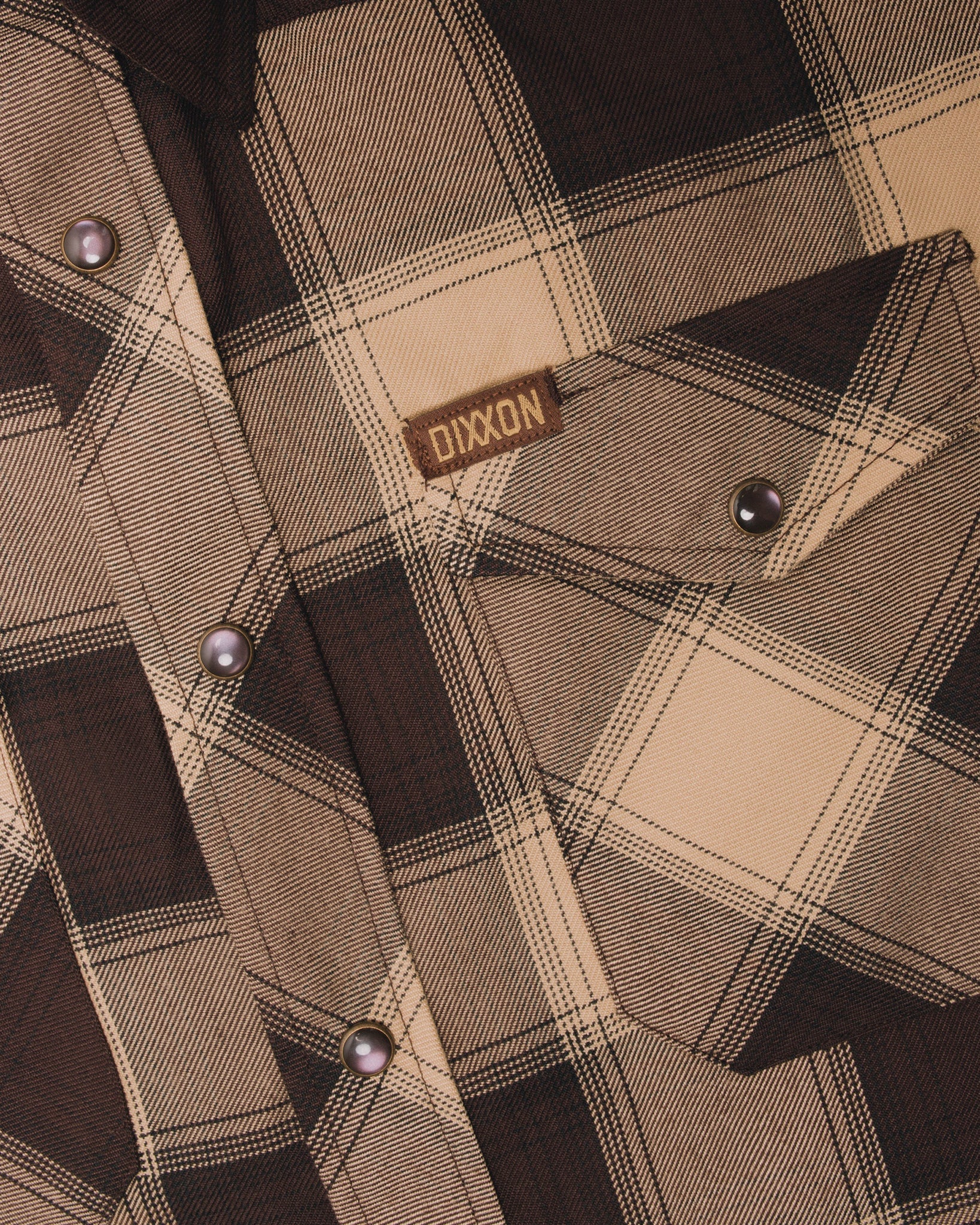 • Brown and tan Dixxon brand tag on the left chest pocket
