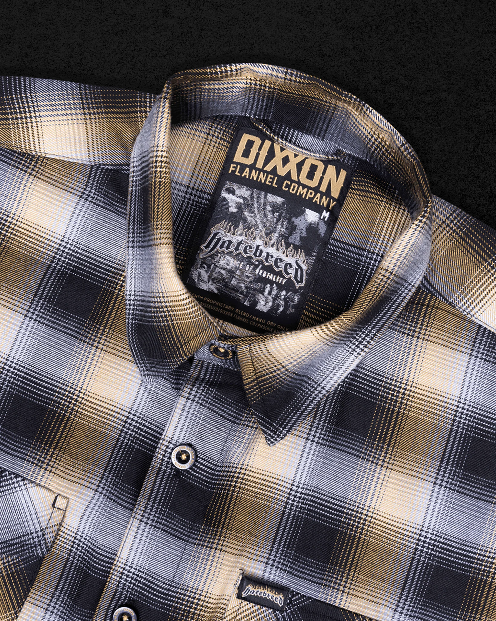 • Black, gold, and white Hatebreed brand tag on the left chest pocket