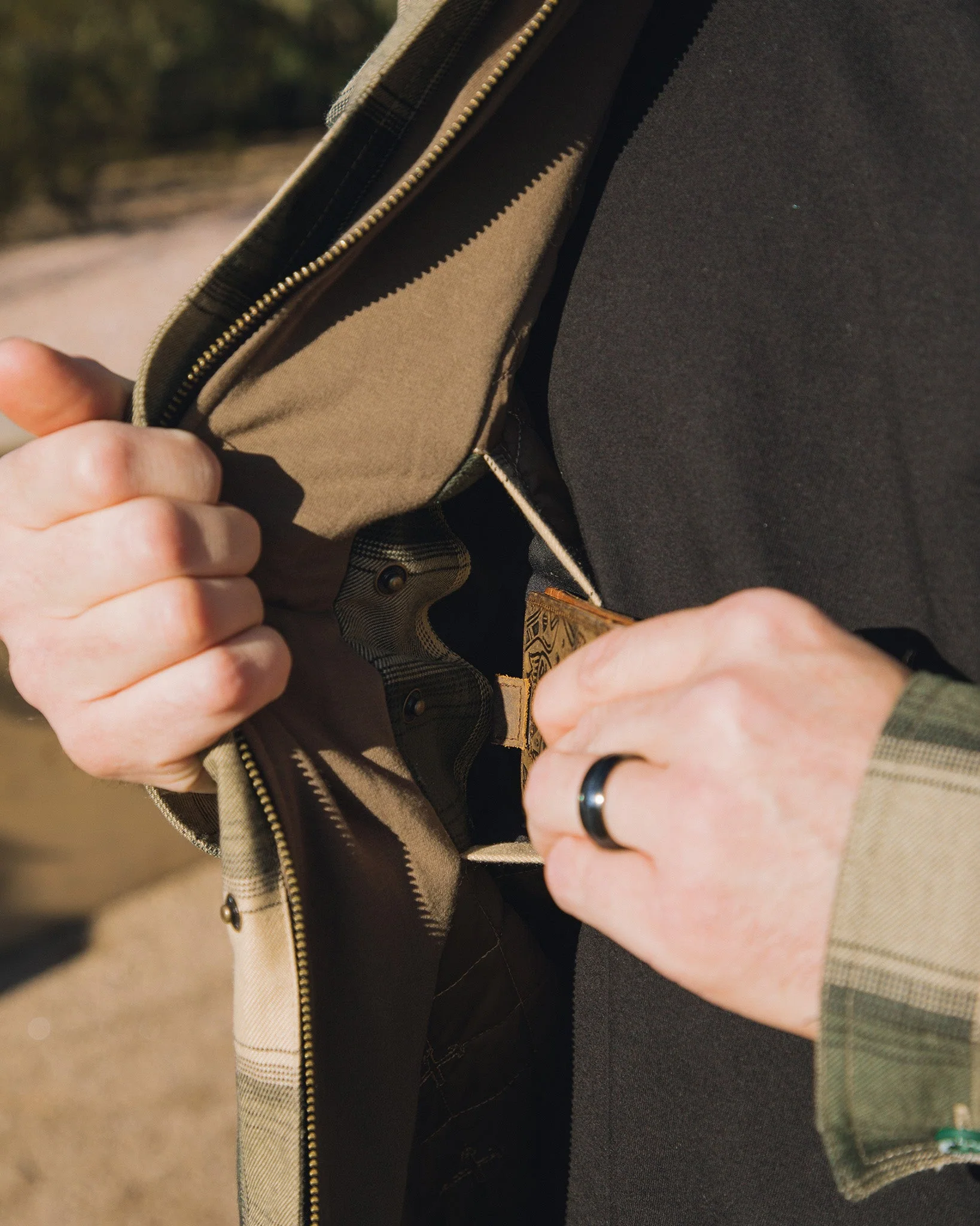 • Dual interior breast pockets with brass snap closure