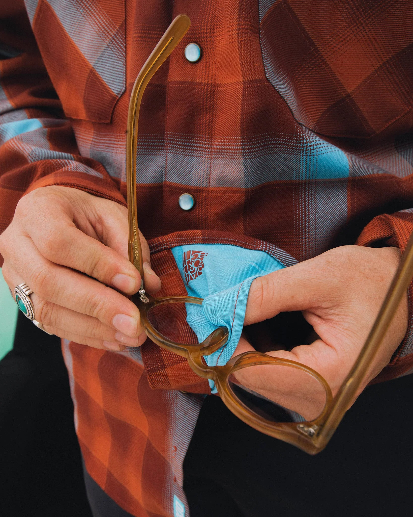 • Microfiber cloth inside the bottom left corner to easily clean your glasses or devices without affecting the look or design