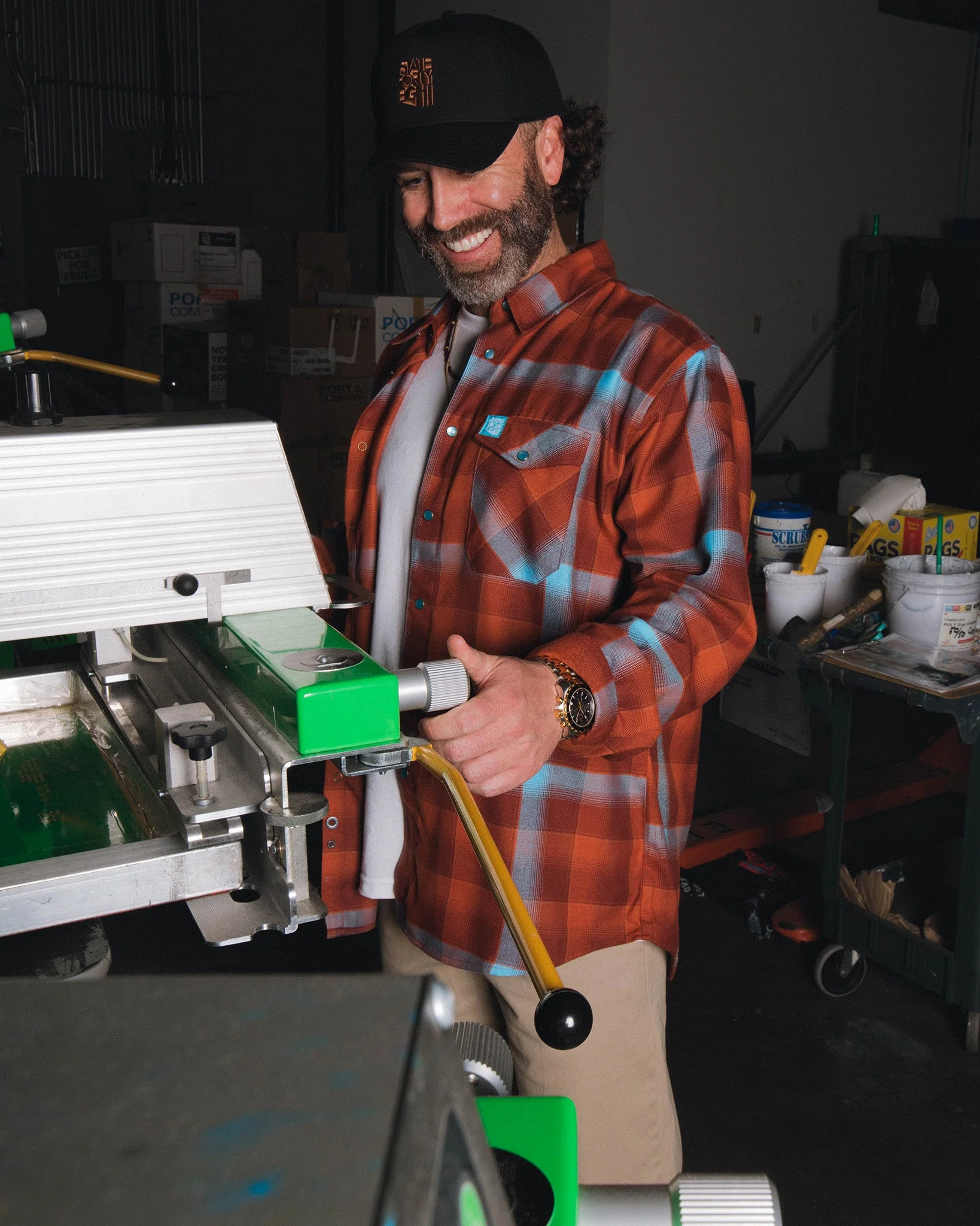 • Men’s brown, orange, red, and blue plaid patterned flannel shirt